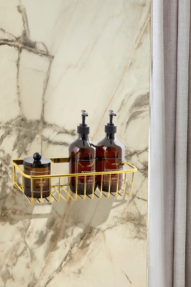 Przedmiotem sprzedaży jest półka / koszyk druciana, wykonana z dobrej jakości drutu stalowego malowanego na kolor złota. Koszyk przeznaczony do montażu na ścianie. Przedmiotowa półka znalazła uznanie wśród osób chcących efektownie wykorzystać miejsce w swojej łazience. Półka pomieści drobne kosmetyki potrzebne w łazience, a ponadto doda uroku i sprawi, że łazienka stanie się gustowna i elegancka. Naszą półkę polubili również majsterkowicze na różne drobiazgi do garażu, warsztatu czy spiżarki. Chętnie kupują ją również właściciele hoteli, pensjonatów czy domów wczasowych jako wyposażenie łazienek. Wymiary 30,5 x 22,5 x 7cm.