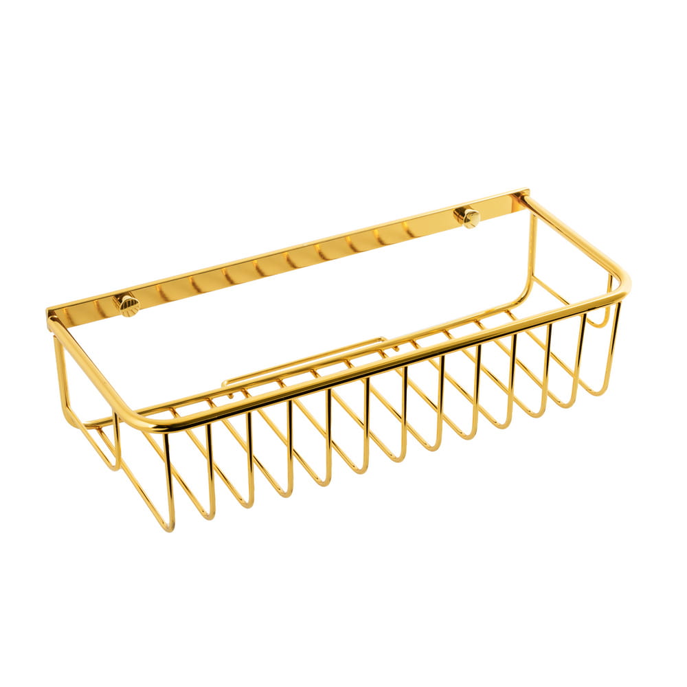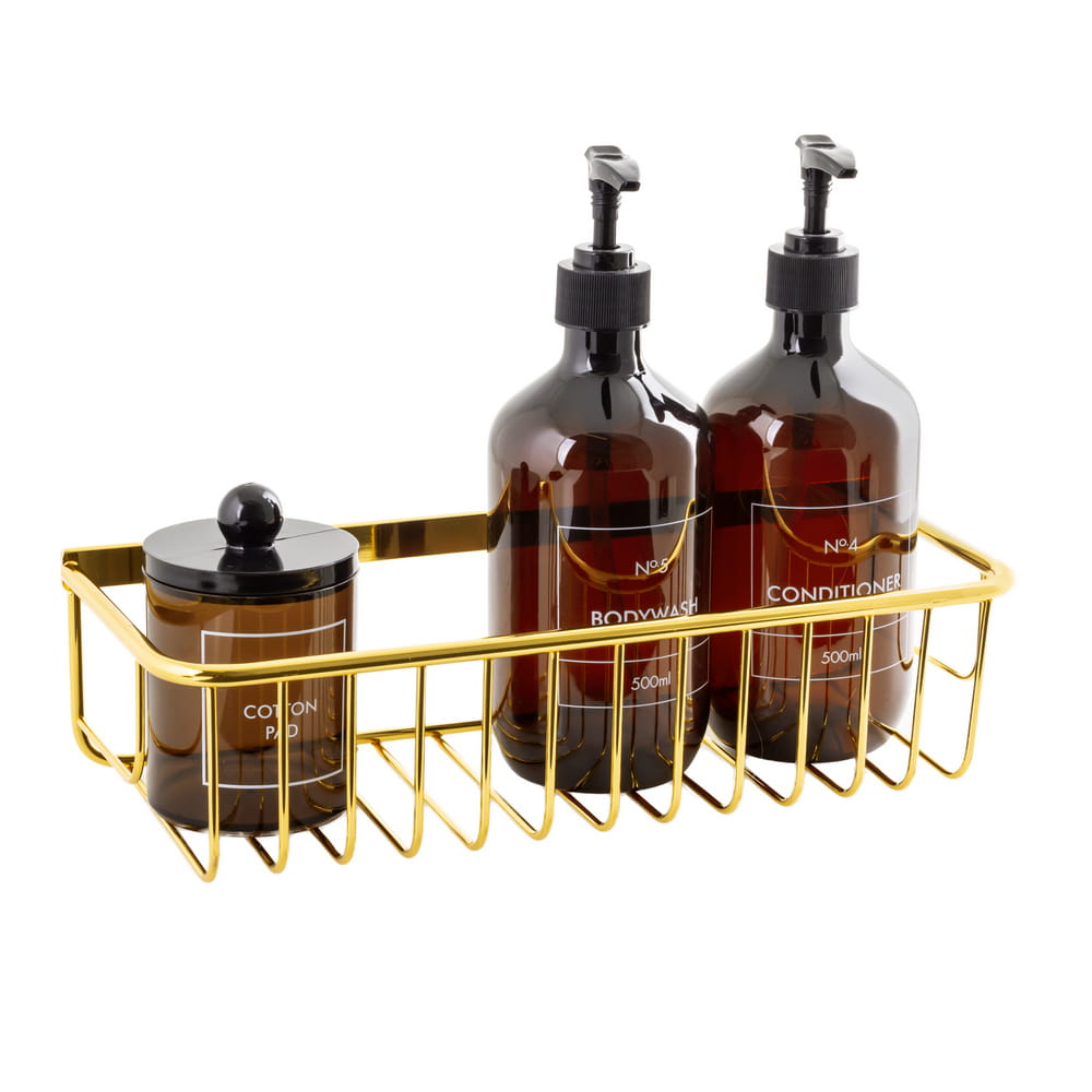 Przedmiotem sprzedaży jest półka / koszyk druciana, wykonana z dobrej jakości drutu stalowego malowanego na kolor złota. Koszyk przeznaczony do montażu na ścianie. Przedmiotowa półka znalazła uznanie wśród osób chcących efektownie wykorzystać miejsce w swojej łazience. Półka pomieści drobne kosmetyki potrzebne w łazience, a ponadto doda uroku i sprawi, że łazienka stanie się gustowna i elegancka. Naszą półkę polubili również majsterkowicze na różne drobiazgi do garażu, warsztatu czy spiżarki. Chętnie kupują ją również właściciele hoteli, pensjonatów czy domów wczasowych jako wyposażenie łazienek. Wymiary 26 x 11,5 x 6cm.