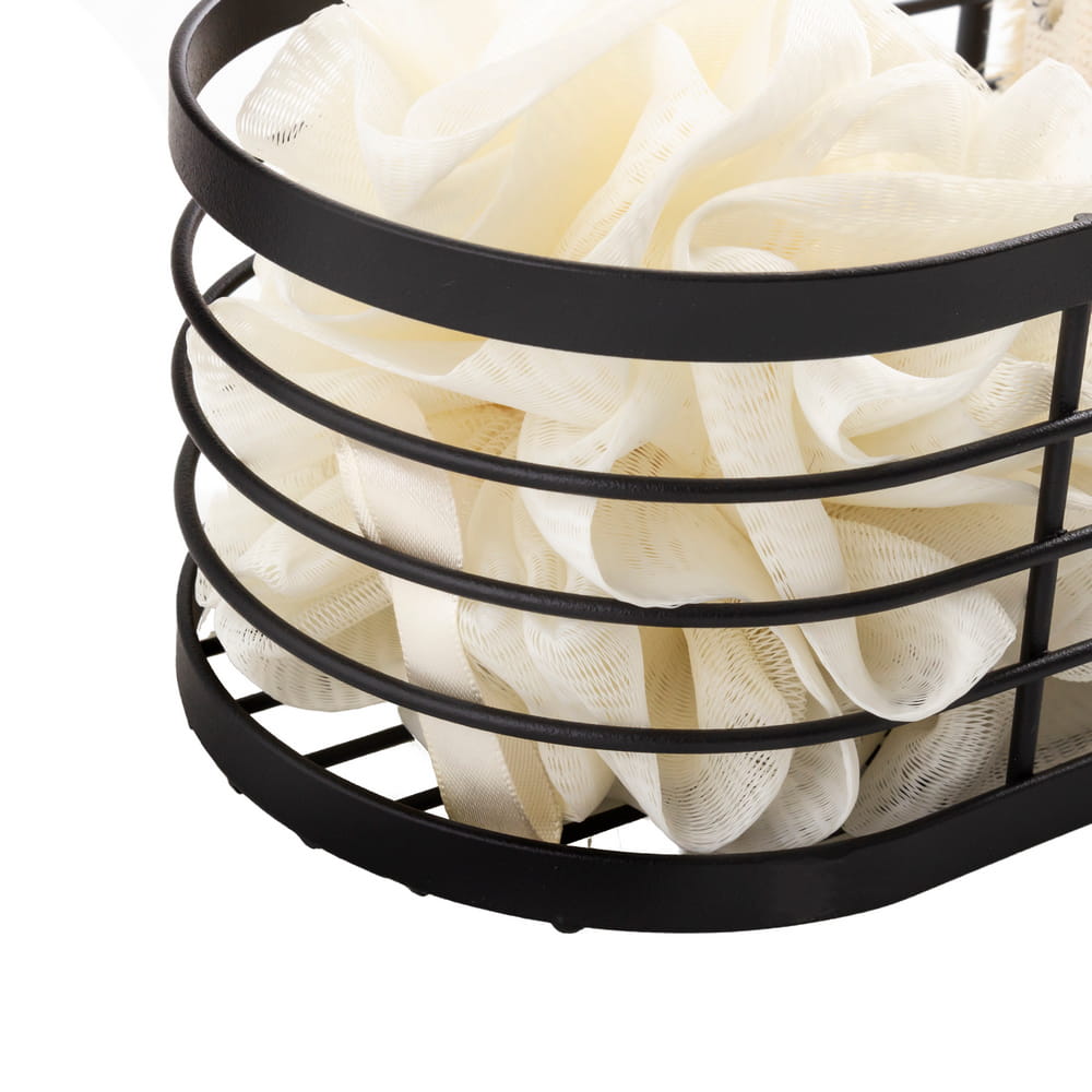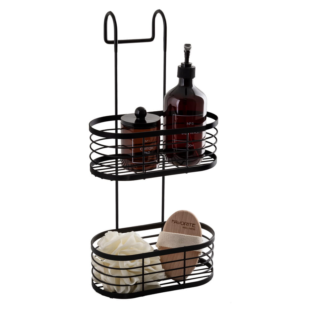 Przedmiotem sprzedaży jest industrilana półka druciana, wykonana z dobrej jakości drutu stalowego malowanego proszkowo na kolor czarn. Dwupiętrowa (dwa koszyki) przeznaczona do zawieszenia bez wiercenia za pomocą ucha. Dodatkowo ucho półki, którym zawiesza się półkę jest obciągnięte gumową osłonką, aby nie zniszczyć kabiny i dodatkowo nie ślizgać się / przemieszać po powierzchni na której została zawieszona. Przedmiotowa półka znalazła uznanie wśród osób chcących efektownie wykorzystać miejsce w swojej łazience, a do tego nie chcą wiercić dziurek w kafelkach lub ścianie. Półka pomieści wszystkie niezbędne kosmetyki potrzebne w kabinie prysznicowej, a ponadto doda uroku i sprawi, że łazienka stanie się gustowna i elegancka. Naszą półkę polubili również majsterkowicze na różne drobiazgi do garażu, warsztatu czy spiżarni. Szczególnie polecana do zawieszenia na kabinie prysznicowej lub drążku. Wymiary 23,5 x 18 x 48cm.