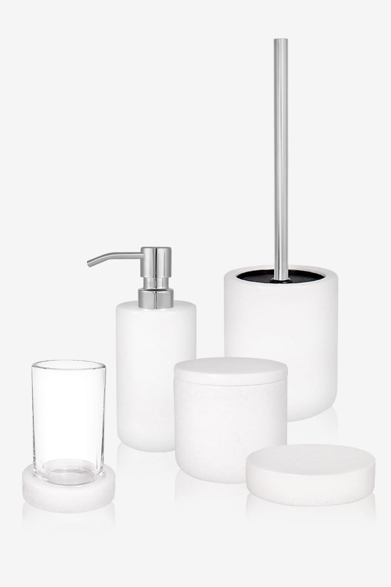 Przedmiotem sprzedaży jest komplet wykonany z marmuru. Został zaprojektowany w klasycznej, prostej formie. Dzięki temu stanowi atrakcyjny oraz ponadczasowy element wyposażenia stylowej łazienki, a także doskonale komponuje się z innymi akcesoriami z kolekcji Q-BATH. Elementem wyróżniającym są migoczące drobinki na bieli marmuru. Komplet spośród innych na rynku wyróżnia precyzyjne wykonanie, najwyższa jakość i funkcjonalna prostota, która tak istotna jest w przestrzeni kąpielowej. Do kamiennego dozownika została dobrana pompka ze stali nierdzewnej, charakteryzująca się najwyższą wytrzymałością i perfekcyjnym stanem przez długie lata. To kolejna propozycja z linii Pure Natural, która zachwyca bogactwem piękna kamieni naturalnych. Produkty wykonane z kamienia naturalnego mogą różnić się kolorem, odcieniem, wzorem i fakturą. W zależności od natury bloku kamiennego z którego kamień jest cięty mogą wystąpić różnice w przeważającym kolorze danego produktu. Wzór na kamieniu naturalnym jest unikalny.