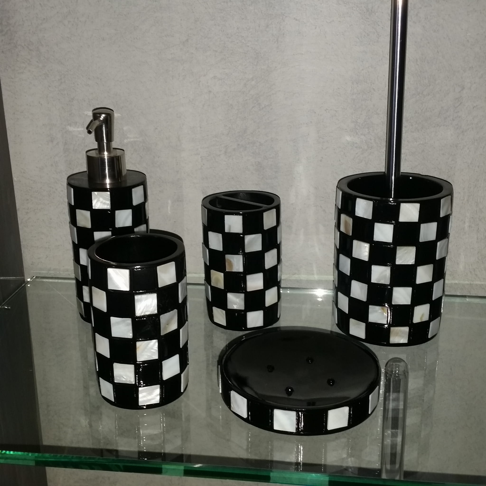 Przedmiotem sprzedaży jest komplet / zestaw do łazienki o nazwie Pierre. Wykonany został z masy żywicznej, aby był bardziej odporny na stłuczki od ceramiki. Składa się z dozownika na mydło w płynie, mydelniczki, kubeczka na szczoteczki, kubka i szczotki toaletowej. W wyglądzie i dotyku przypomina ceramikę. Jest wykonany niezmiernie precyzyjnie zadowoli gusta najbardziej wybrednych klientów, a ich łazienki staną się eleganckie i niepowtarzalne z naszym kompletem.
