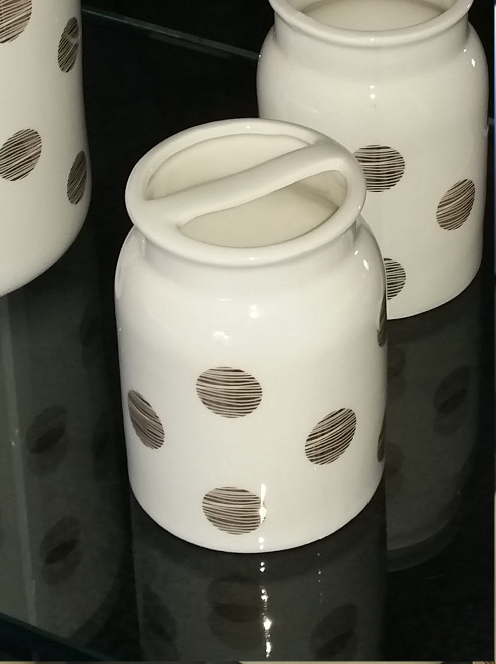 Przedmiotem sprzedaży jest kubek na szczoteczki do zębów o nazwie Daisy. Wykonany z białej ceramiki ze złoceniami w postaci kropek. Jego wyjątkowe kształty w postaci jak to mówią nasi klienci baryłek na miód lub baniek na mleko sprawiają, że jest wyjątkowy, a łazienka dzięki niemu stanie się wyjątkowa.