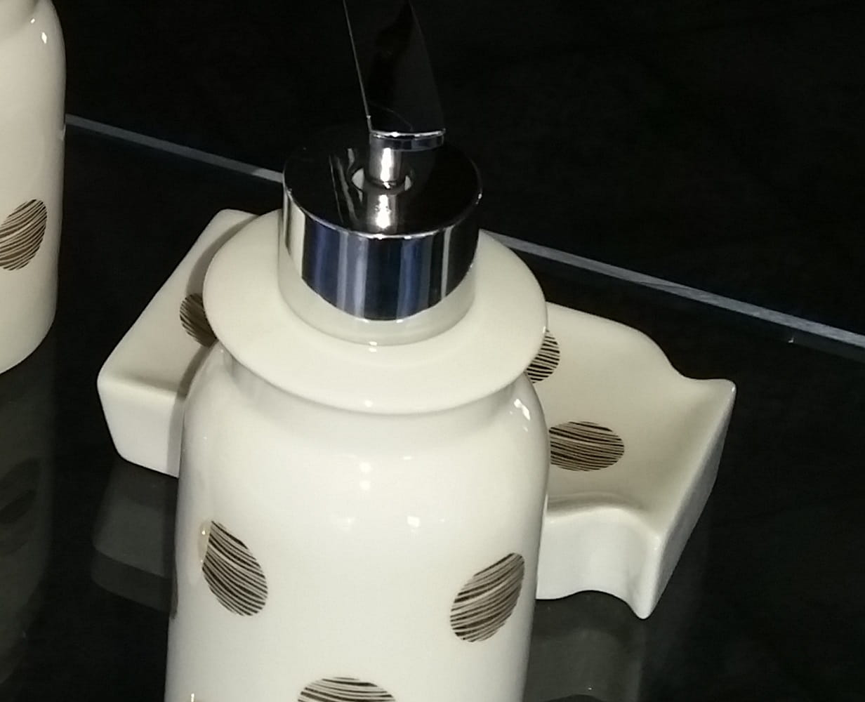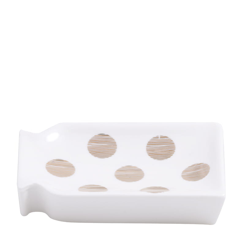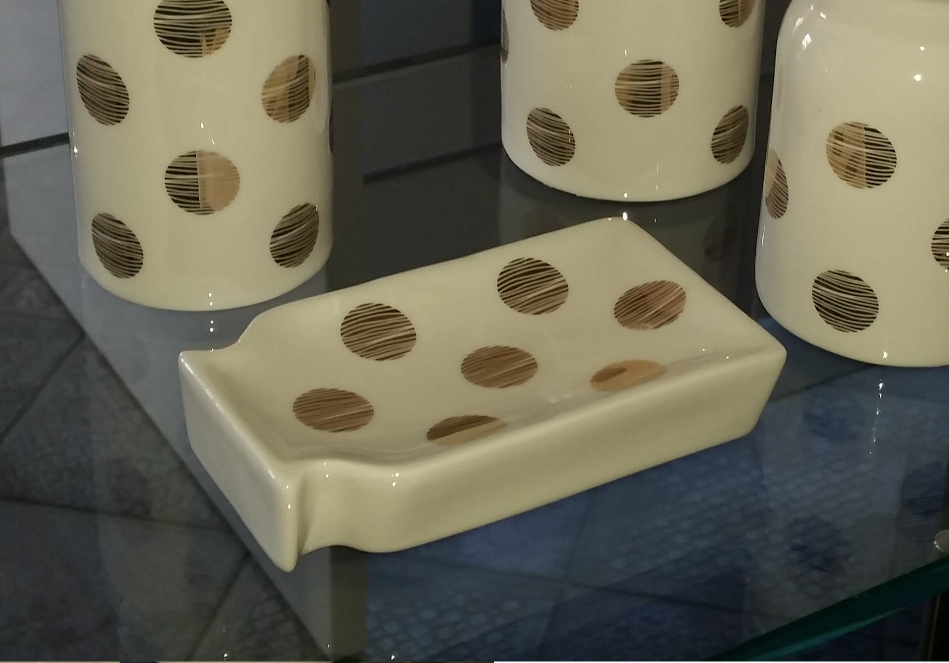 Przedmiotem sprzedaży jest mydelniczka o nazwie Daisy. Wykonana z białej ceramiki ze złoceniami w postaci kropek. Jej wyjątkowe kształty w postaci jak to mówią nasi klienci baryłek na miód lub baniek na mleko sprawiają, że jest wyjątkowa, a łazienka dzięki niej stanie się wyjątkowa.