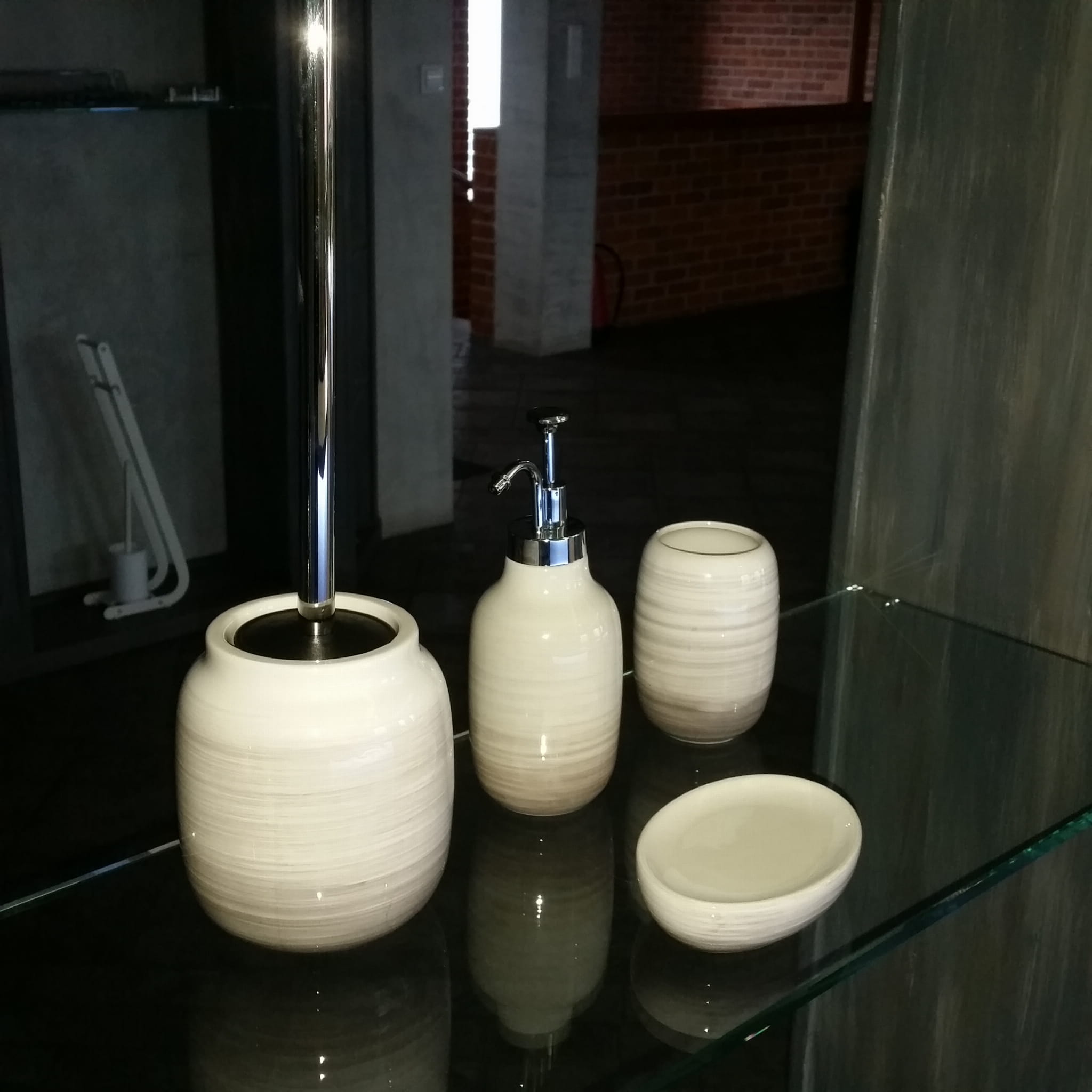 Przedmiotem sprzedaży jest komplet łazienkowy o nazwie Jang. Wykonany z perłowej ceramiki, która robi piorunujące wrażenie. Z tymi przedmiotami łazienka staje się elegancka, nowoczesna i niepowtarzalna. Zestaw składa się z dozownika na mydło w płynie, mydelniczki i kubeczka.