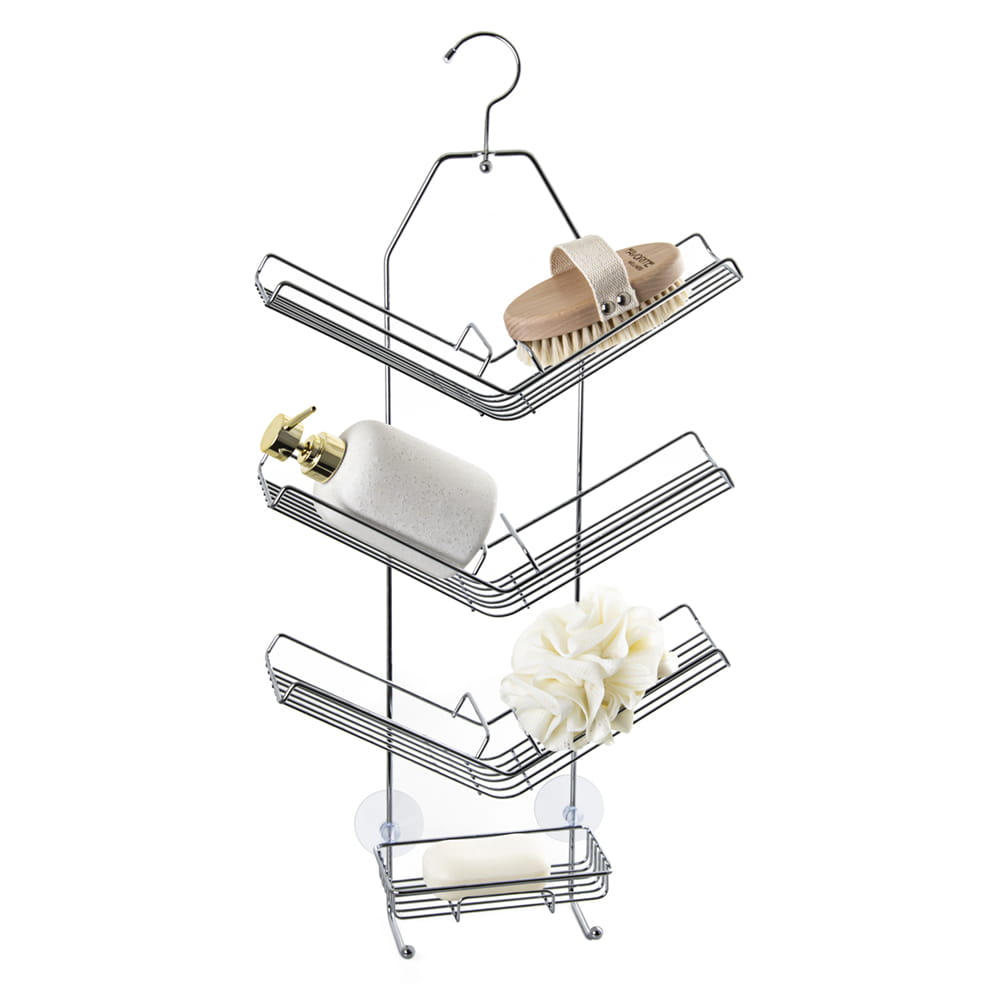 Przedmiotem sprzedaży jest nowoczesna półka pod prysznic. To idealne rozwiązanie dla każdego, kto ceni sobie funkcjonalność i styl. Zawieszana na kabinę prysznicową lub parawan nawannowy, wykonana jest z drutu pokrytego chromem o wysokim połysku, który dodaje łazience elegancji. Półka posiada, aż sześć ukośnych miejsc do przechowywania, które doskonale nadają się do butelek i podłużnych pojemników, takich jak szampony, odżywki, żele pod prysznic i mydła w płynie. Skos półek umożliwia wygodne segregowanie kosmetyków oraz przechowywanie nawet bardzo wysokich produktów. Na dole znajduje się mniejsza półeczka, idealna do odłożenia kostki mydła, pumeksu czy maszynki do golenia. Dodatkowo, dwa haczyki umożliwiają wygodne zawieszenie prysznicowych akcesoriów, takich jak gąbki czy szczotki. Półka wyróżnia się nowoczesnym designem, dużą pojemnością przechowywania oraz wysoką jakością wykonania, co czyni ją nie tylko praktycznym, ale i stylowym dodatkiem do każdej łazienki. Wymiary 33 x 58 x 9cm.