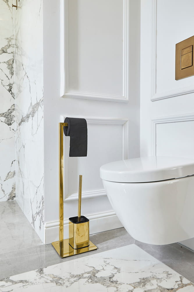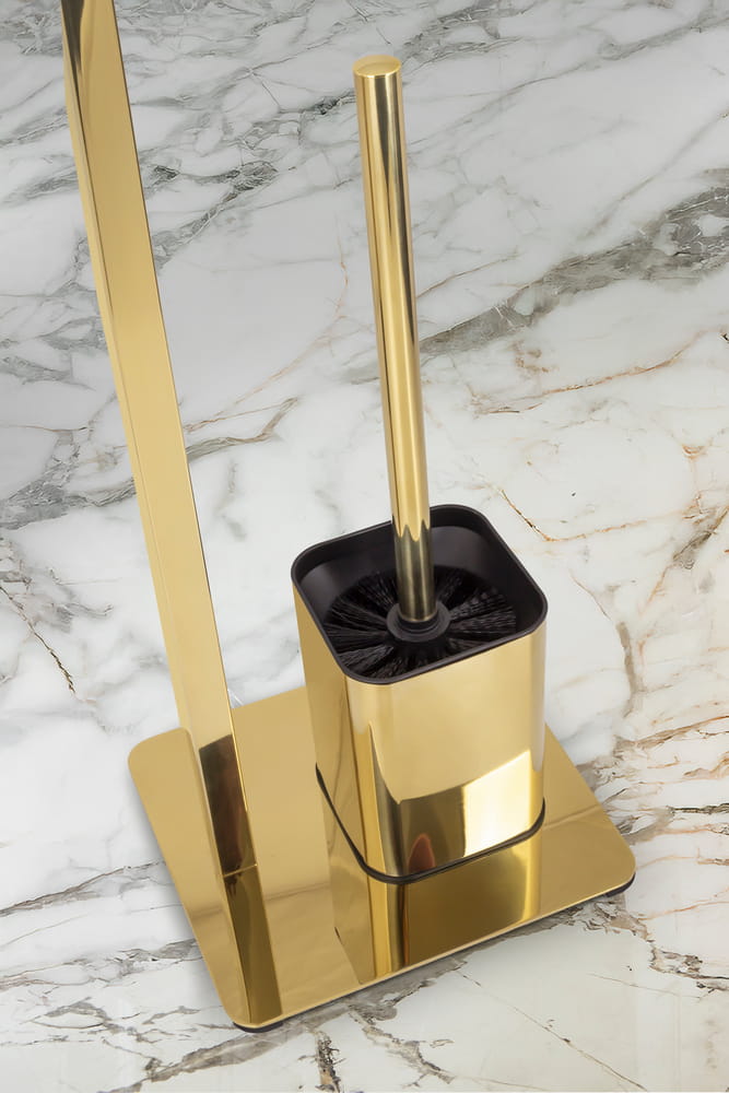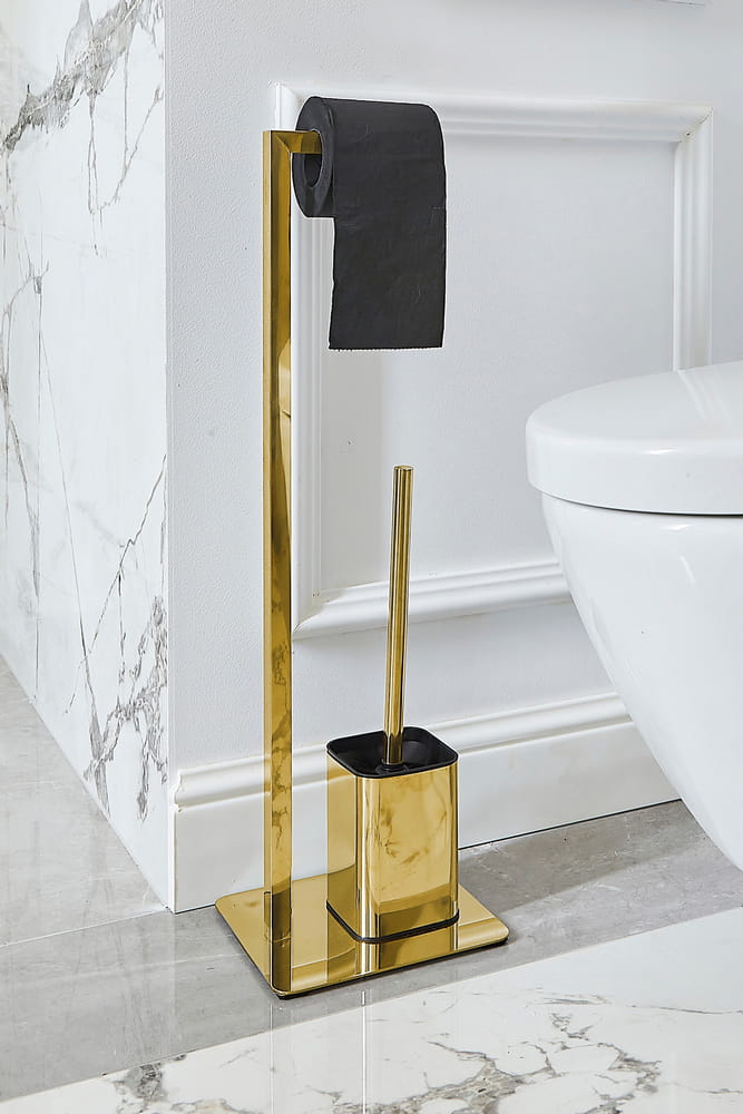 Przedmiotem sprzedaży jest stojak łazienkowy na papier ze szczotką do WC, wykonany ze stali malowanej na złoto, ABSu i PP. Wymiary: 10,5 x 19,2 x 67,5cm.