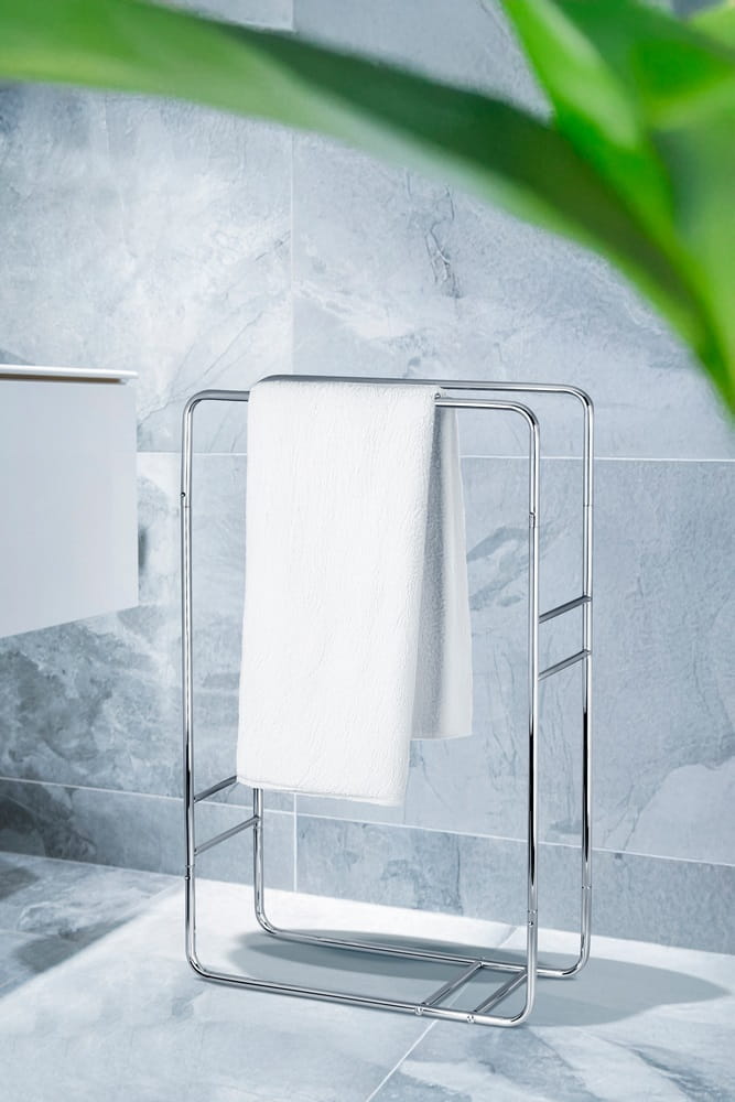 Przedmiotem sprzedaży jest wieszak łazienkowy stojący. Wykonany ze stali chromowanej. W podstawie posiada specjalny obciążnik, aby zapobiegał wywracaniu się wieszaka. Wymiary wieszaka 36 x 28 x 87cm. Nasza łazienka wymaga dobrej organizacja miejsca, którego bardzo często brakuje, nasz wieszak o kodzie 030 od lat pomaga naszym klientom sprytnie zorganizować tą przestrzeń. Dodatkowo chromowane wykończenie doda kunsztu i elegancji przestrzeni łazienkowej. Obracane we wszystkich kierunkach pałąki można ustawić dowolnie, zgodnie z Państwa oczekiwaniami i miejscem w łazience.