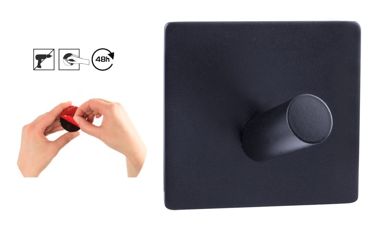 Przedmiotem sprzedaży jest samoprzylepny wieszak na ręczniki,ścierki, kurtki itp. Wieszak wykonany ze stali malowanej proszkowo na kolor czarny, przeznaczony do powieszenia na każdej dającej się przykleić powierzchni za pomocą super taśmy 3M (są to takie taśmy jak reklamują w TV typu 3M, Tesla, produkt dla osób które nie chcą wiercić w kafelkach lub ścianie).