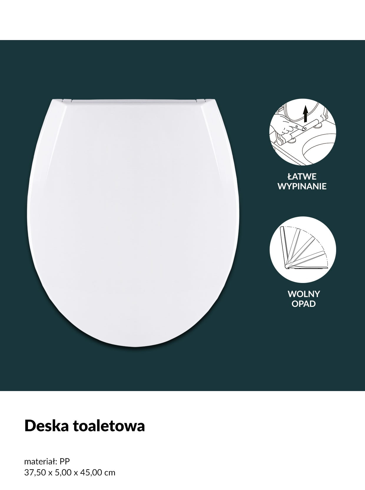 Przedmiotem sprzedaży jest śnieżnobiała wolno opadająca deska sedesowa. Deska wykonana z białego tworzywa. Deska jest uniwersalna pasująca do większości sedesów. Wymiary deski 37,5 - 45cm (wymiar otworu 28 x 23cm). HIT Rozstaw zawiasów regulowany 8 - 17,5cm. Deska bardzo ładna, sprawi że Twoja łazienka stanie się elegancka i niepowtarzalna.