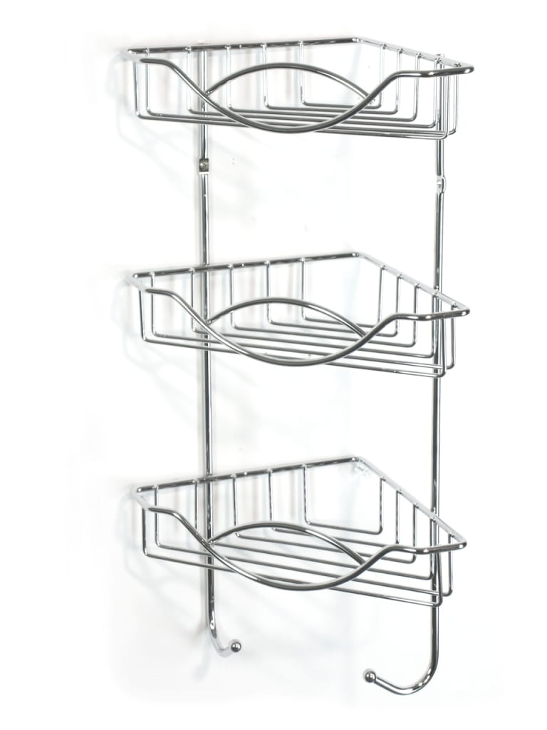 Przedmiotem sprzedaży jest zgrabna rogowa półka druciana trzykondygnacyjna, wykonana z dobrej jakości drutu stalowego chromowanego. Trzypiętrowa przeznaczona do montażu w rogu ściany, z trzema półkami i dwoma wieszakami u dołu na których można powiesić ręczniki, ścierki, gąbki lub myjki. Przedmiotowa półka znalazła uznanie wśród osób chcących efektownie wykorzystać miejsce w swojej łazience. Półka pomieści drobne kosmetyki potrzebne w łazience na trzech poziomach, a ponadto doda uroku i sprawi, że łazienka stanie się gustowna i elegancka. Wysokość 43,5 x 22 x 14,5cm.